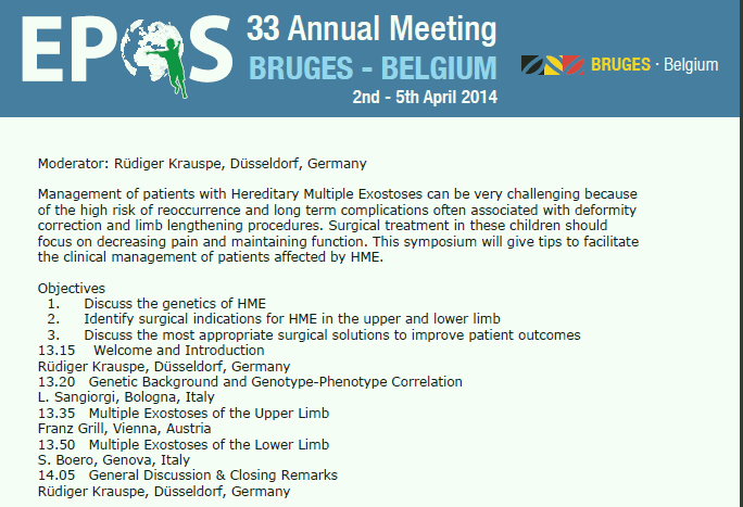 | Our Foundation would like to thank EPOS 2014 and participants especially Luca Sangiorgi, MD. Ph.D who is a foundation member of our Scientific and Medical Board Our Foundations Vice President and National Director of Research Sarah Ziegler held an educational display at the European Peadiatric Orthopaedic Society annual congress April 17-20, 2013 in Athens Greece. This meeting attracts Pediatric Orthopaedic surgeons from over 32 countries. During this conference. Dr. Dror Paley presented "Treatment of the Hip in Multiple Hereditary Exostoses (MHE) by Safe Surgical Dislocation " |